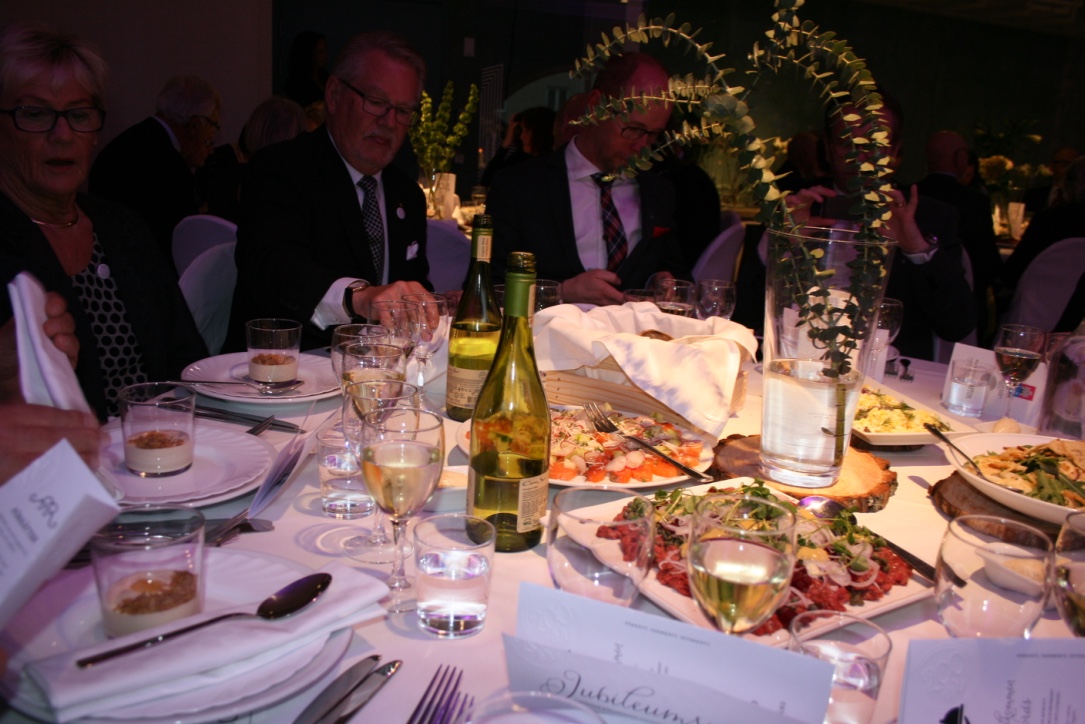 Tommy Myllymäkis trerättersmeny var ett gastronomiskt mästerverk och bara tanken på maten får det fortfarande att vattnas i munnen. Till förrätten bjöds det bl a på mildrökt lax med pepparrot, råbiff med rödbeta och matjesill med ägg. Till varmrätten dukades det upp rostbiffstekt kalv, jordärtskockor, bakad tomat, med fänkålsrostad färskpotatis och persiljesky. Desserten innehöll rabarberpaj med vaniljsås, citrontarte och chokladkaka med vispad grädde. Malin Qvänstedt ansvarade för dekor och dukning och hon gjorde det med bravur, inte en detalj var för liten att beakta.